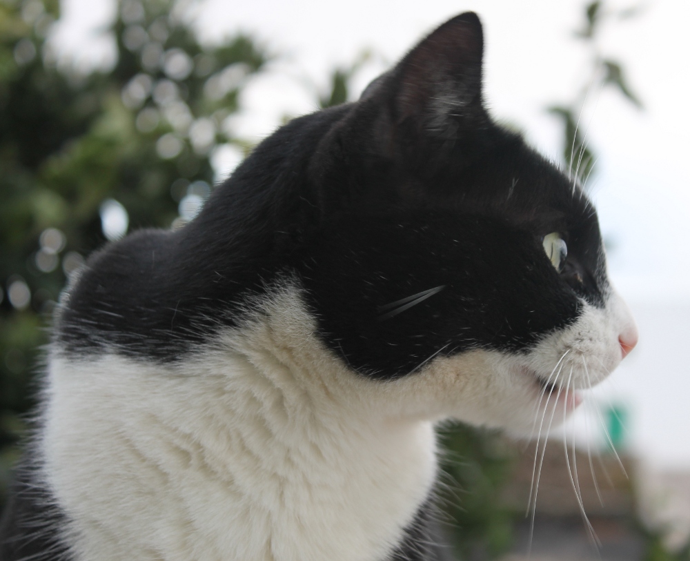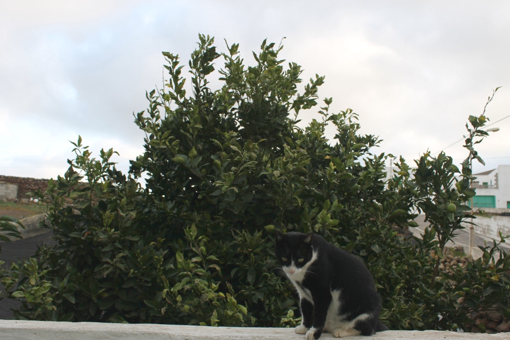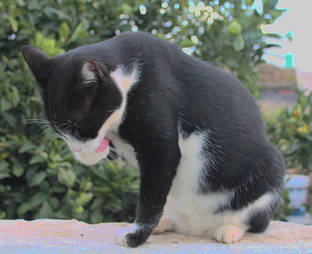 A la mañana siguiente salí de casa y él estaba allí, en su naranjo. Me acerque para acariciarlo y se dejo, me dí cuenta de que se trataba de un macho y de que está castrado.
